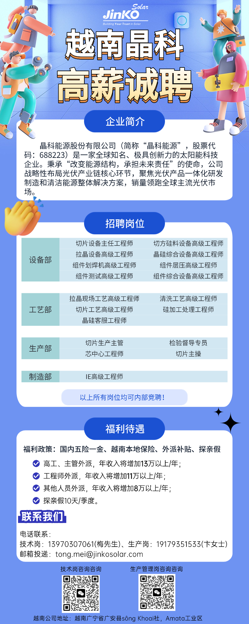越南晶科补贴13W+高薪诚聘技术、管理、生产人才!!(中籍) 位置:首页 > 招聘快讯 时间:2025-11-07 KOT中越英才网 联系:技术岗:13970307061(梅先生)、生产岗:19179351533(卞女士) 公司:越南晶科 地址:广安县sóng Khoai社, Amata工业区 【更多职位】【注册我的简历】 (浏览:次) 推荐企业 【招贤纳士】春秋电子(越南)有限公司招聘中干 [招聘快讯] 行业: 光伏聘|月薪55K越南EliTe Solar招聘生产、工艺、设备、厂务等大量岗位 [招聘快讯] 行业: 广东投资越南的大型玩具厂高薪招聘品质PMC财务HR经理及技术工人 [招聘快讯] 行业: 胡志明市招聘人事行政主管1名工资2000~2200万越盾年终奖1~2个月 [招聘快讯] 行业: 胡志明市招聘区域销售工程师3名底薪1400~1600万越盾+出差补贴 [招聘快讯] 行业: 最新企业 求职岗位:电气工程师 招聘-num师傅-厂长 越南晶科补贴13W+高薪诚聘 质量管理部经理/总监 【招贤纳士】春秋电子(越南 热门企业 2025-08-02中越招聘快讯 2025-8-7越南招聘快讯 2025-8-26越南中资企业招 2025-09-06越南招聘职位: 2025-08-29越南招聘职位: