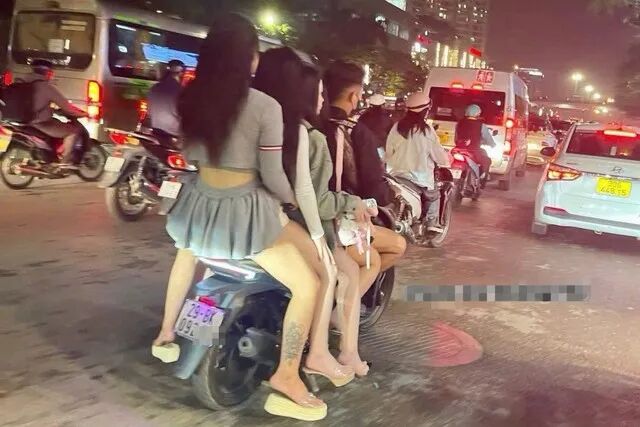 10月30日晚7点30分许,阿兴驾驶一辆悬挂河内车牌的摩托车,在陈维兴(Trần Duy Hưng)街上缓缓行驶,后座竟挤满了四名年轻女孩(见上图)。五人出行,无一佩戴头盔,这夸张的画面很快吸引了路人注意,有人拍照并上传至社交媒体,瞬间引发热议。不少网友调侃:“这是把摩托车当‘变形金刚’了吗?”“五个人的快乐,差点变成五个人的危险!”