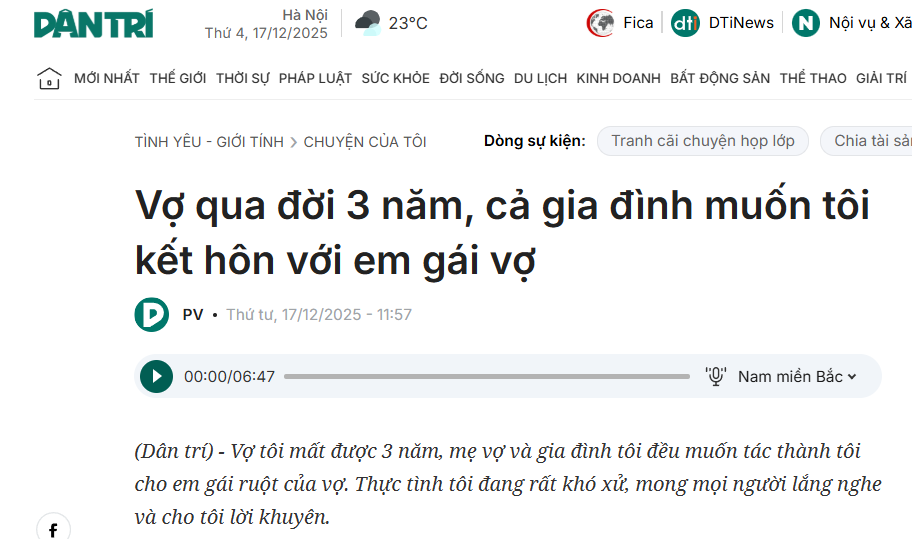 该男子向dantri投稿称:他的妻子去世已三年,岳家和家人都希望他能和妻子的妹妹在一起,但是他内心十分纠结,因此恳请广大网友倾听并给他建议。